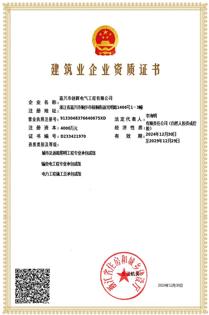 目前我公司已具備電力工程總承包貳級(jí),輸變電工程專業(yè)承包貳級(jí)資質(zhì),城市及道路照明工程專業(yè)承包貳級(jí)資質(zhì),承裝(修、試)電力設(shè)施許可二級(jí)資質(zhì),建筑施工安全生產(chǎn)許可,是浙江省高新技術(shù)企業(yè)、省AAA級(jí)“守合同重信用”企業(yè)。